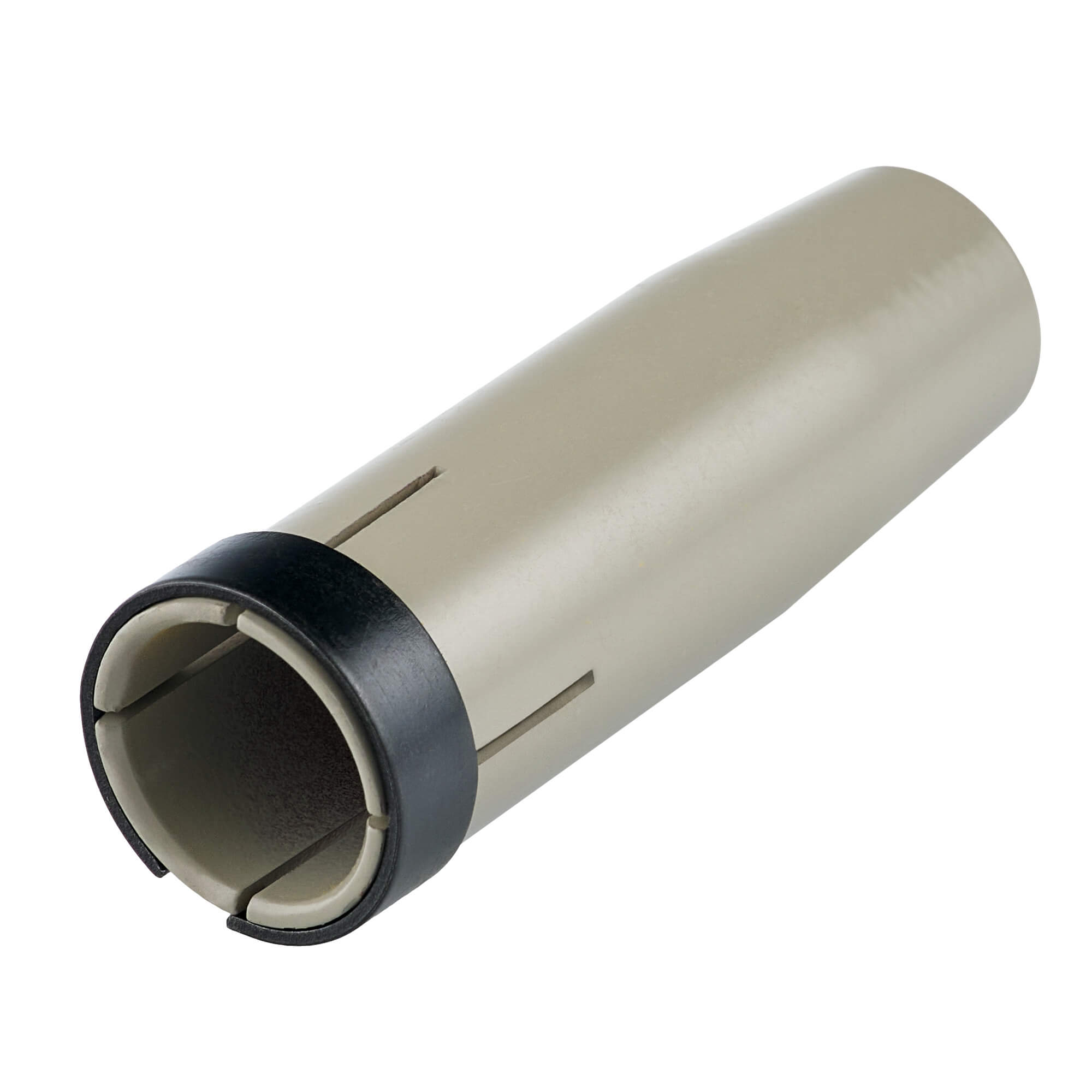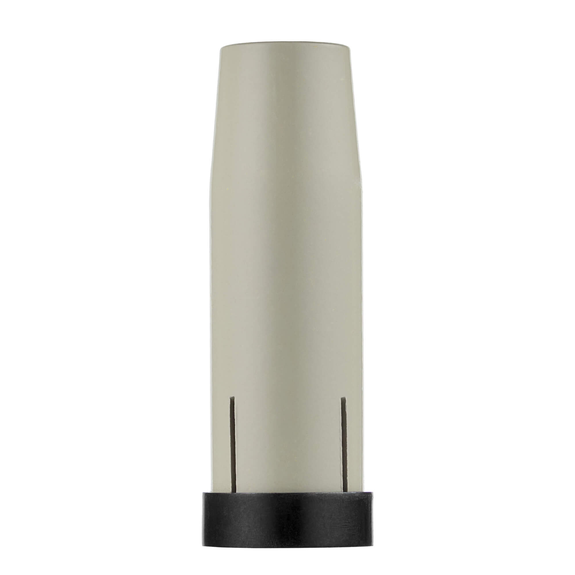 Газораспределительное сопло с керамическим покрытием для полуавтоматических горелок MIG MP 24 и MIG MP 240 всех серий. Выходной внутренний диаметр сопла 12 мм. Сопло используется для равномерного распределения газового потока и для защиты сварочного наконечника от механического воздействия или случайного соприкосновения со свариваемым изделием.Сопло изготовлено из меди, сверху нанесён керамический слой, который работает как электрический и термический изолятор поверхности.Керамическое покрытие наносится специальным технологическим процессом, образуется гомогенный ровный слой, рассчитанный на промышленную эксплуатацию такого газораспределительного сопла. Керамический слой состоит из броннитрида (бор нитрид, BN).Отличительная особенность сопла CRM2412 – это керамическое покрытие:Керамическое покрытие создаёт термобарьер, так как керамика выдерживает очень высокие температуры, не расплавляется и не деформируется.Покрытие препятствует прилипанию сварочных брызг за счёт очень гладкой поверхности. Брызги либо отскакивают, либо слабо держатся и легко счищаются.Из-за отсутствия налипших брызг металла формируется более стабильный газовый поток и дуга. Увеличивается продолжительность работ без остановки и последующей очистки сопла и комплектующих для горелки MIG.Керамический слой заметно увеличивает ресурс сопла и расходных частей сварочной горелки.Область применения сопел с керамическим покрытием:Узкощелевое сваривание труб, толстых стенок. Орбитальная сварка, где сопло или наконечник может задеть стенку свариваемого изделия. В таком случае керамическое покрытие выступает в роли диэлектрика, защищает от коротких замыканий, снижает риск «поджигания» дуги по боковой стенке и медных включений в металл шва.Сварка порошковой проволокой, где нужно увеличить токи и скорость без потери качества корня.Автоматизированные линии и роботизация, где критичны длительные остановки рабочего процесса и присутствует минимальное обслуживание сварочных горелок.