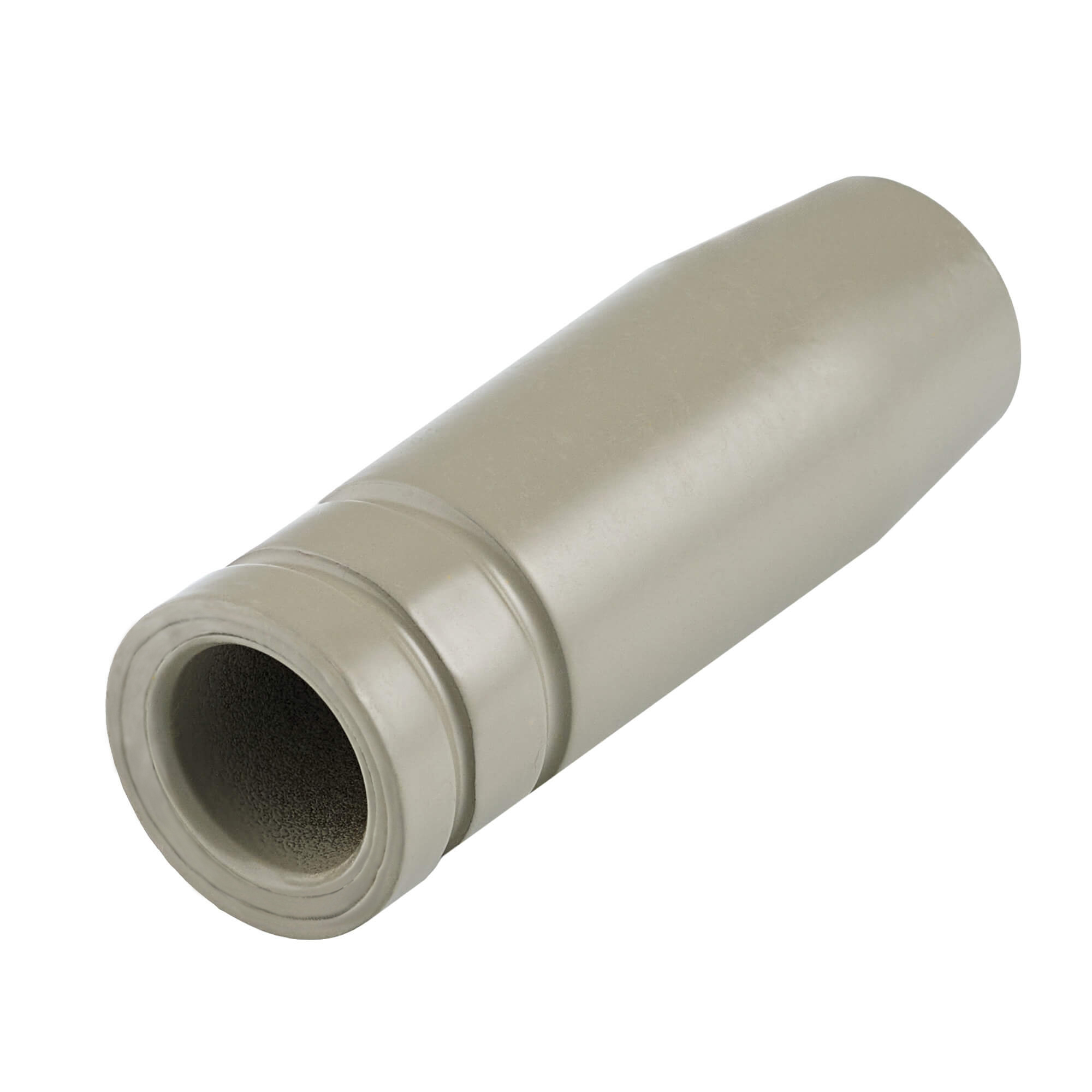 Газораспределительное сопло с керамическим покрытием для полуавтоматических горелок MIG MP 15 всех серий. Выходной внутренний диаметр сопла 9,5 мм. Сопло используется для равномерного распределения газового потока и для защиты сварочного наконечника от механического воздействия или случайного соприкосновения со свариваемым изделием.Сопло изготовлено из меди, сверху нанесён керамический слой, который работает как электрический и термический изолятор поверхности.Керамическое покрытие наносится специальным технологическим процессом, образуется гомогенный ровный слой, рассчитанный на промышленную эксплуатацию такого газораспределительного сопла. Керамический слой состоит из броннитрида (бор нитрид, BN).Отличительная особенность сопла CRM1595 – это керамическое покрытие:Керамическое покрытие создаёт термобарьер, так как керамика выдерживает очень высокие температуры, не расплавляется и не деформируется.Покрытие препятствует прилипанию сварочных брызг за счёт очень гладкой поверхности. Брызги либо отскакивают, либо слабо держатся и легко счищаются.Из-за отсутствия налипших брызг металла формируется более стабильный газовый поток и дуга. Увеличивается продолжительность работ без остановки и последующей очистки сопла и комплектующих для горелки MIG.Керамический слой заметно увеличивает ресурс сопла и расходных частей сварочной горелки.Область применения сопел с керамическим покрытием:Узкощелевое сваривание труб, толстых стенок. Орбитальная сварка, где сопло или наконечник может задеть стенку свариваемого изделия. В таком случае керамическое покрытие выступает в роли диэлектрика, защищает от коротких замыканий, снижает риск «поджигания» дуги по боковой стенке и медных включений в металл шва.Сварка порошковой проволокой, где нужно увеличить токи и скорость без потери качества корня.Автоматизированные линии и роботизация, где критичны длительные остановки рабочего процесса и присутствует минимальное обслуживание сварочных горелок.