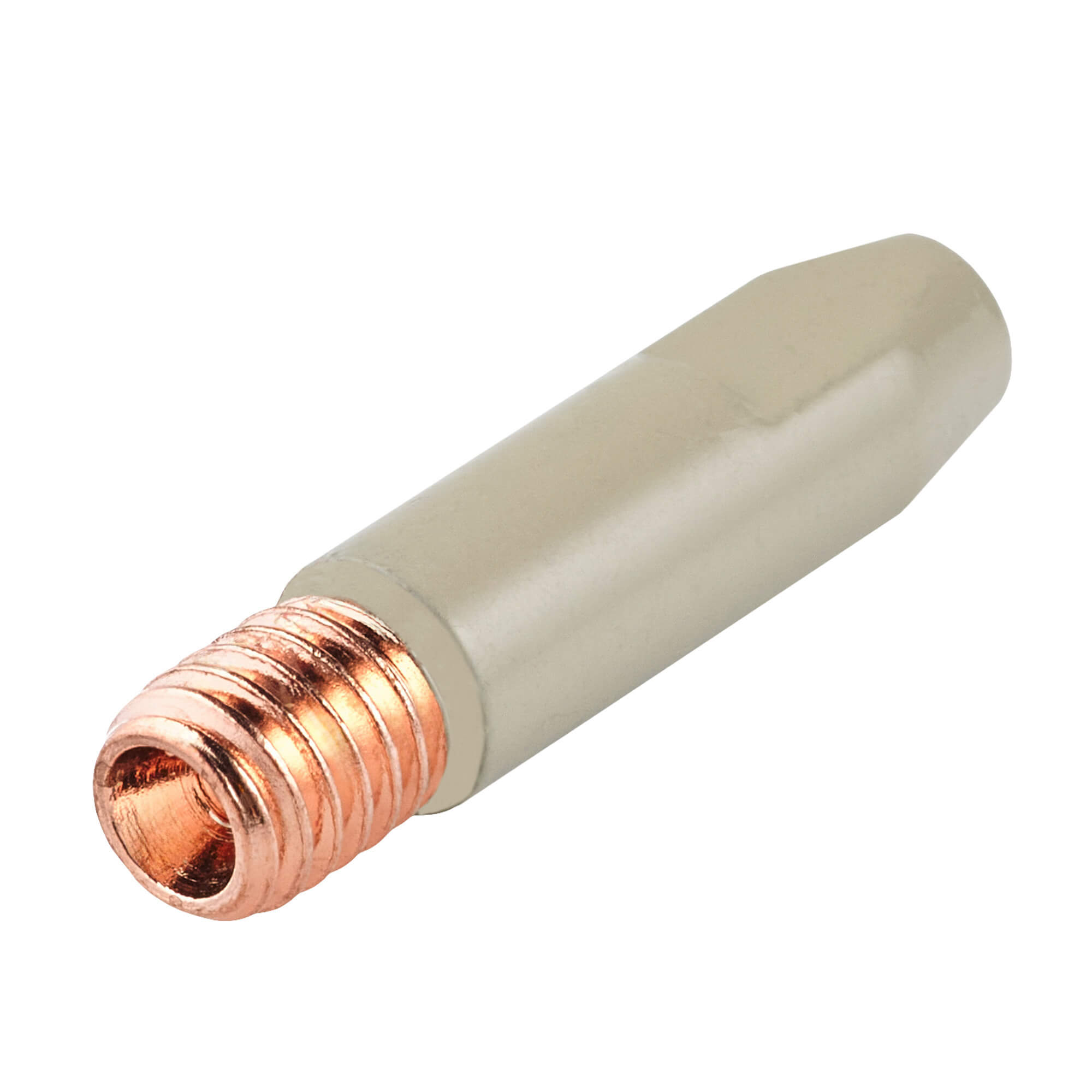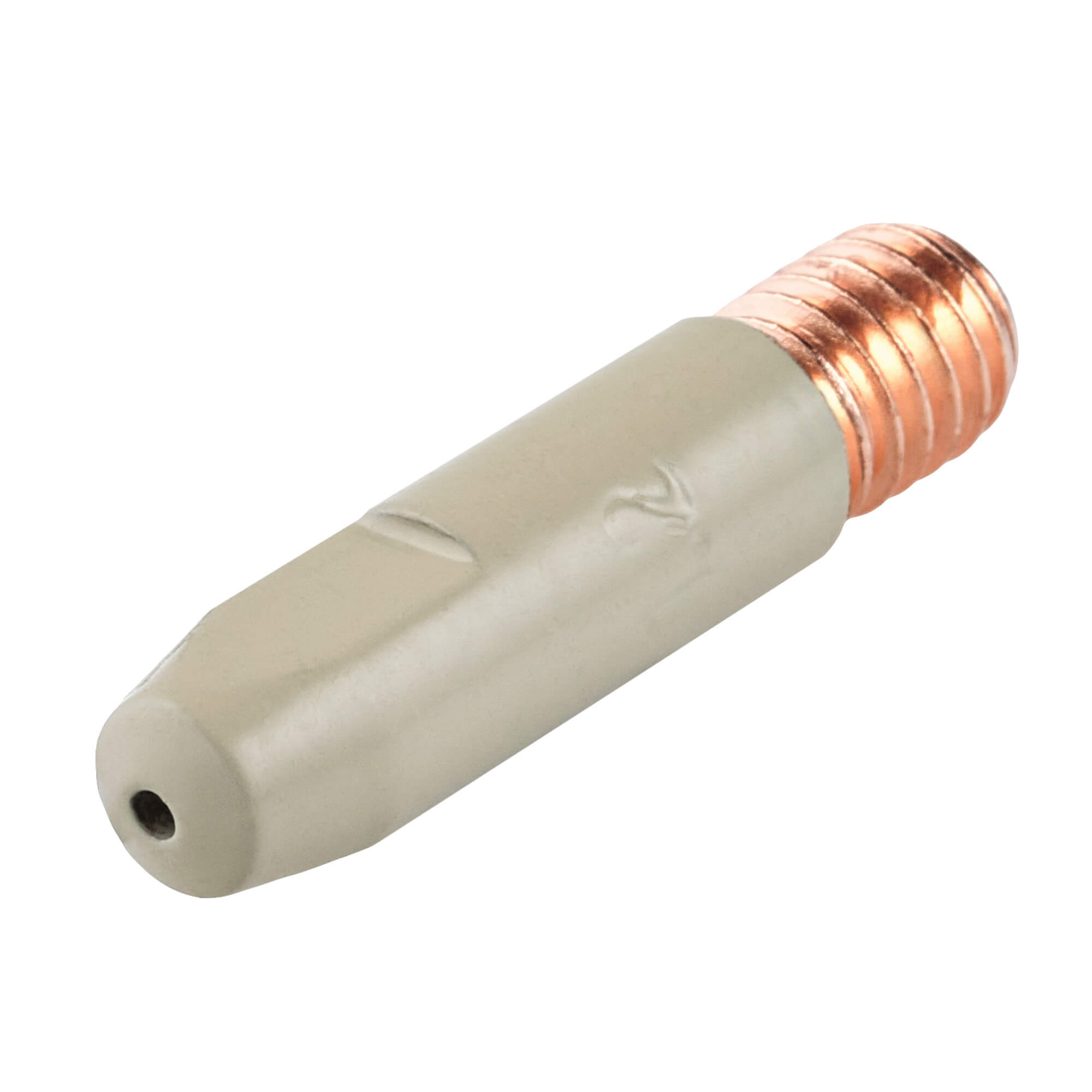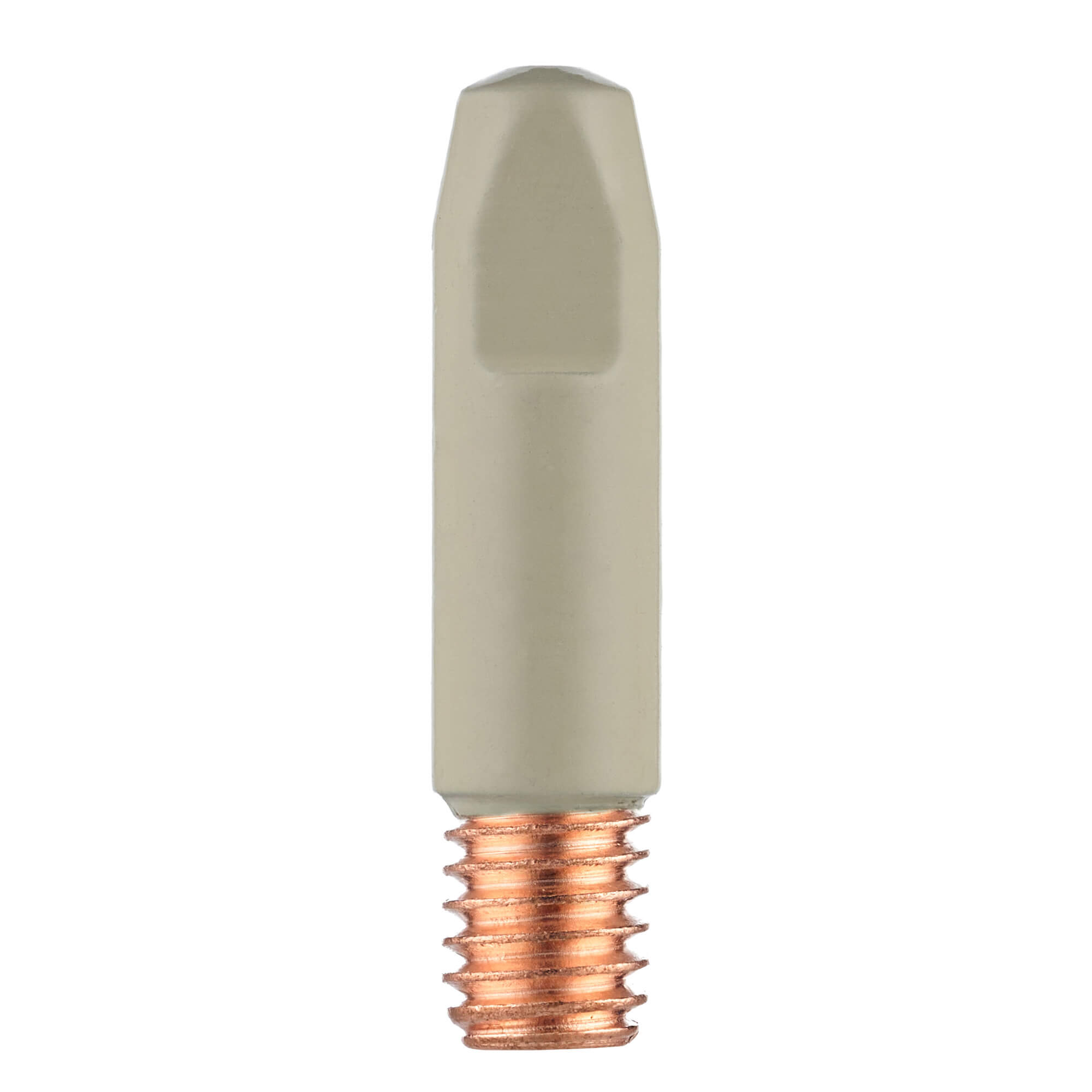 Сварочный наконечник M6 с керамическим покрытием для полуавтоматических горелок всех серий MIG MP 24, 25, 26, 36, 400 и 500. Используется для проволоки диаметром 1,2 мм.Наконечник изготовлен из меди (E-CU), сверху нанесён керамический слой, который работает как электрический и термический изолятор поверхности.Керамическое покрытие наносится специальным технологическим процессом, образуется гомогенный ровный слой, рассчитанный на промышленную эксплуатацию такого газораспределительного сопла. Керамический слой состоит из броннитрида (бор нитрид, BN).Отличительная особенность стандартного наконечника CRM6810-12 – это керамическое покрытие:Керамическое покрытие создаёт термобарьер, так как керамика выдерживает очень высокие температуры, не расплавляется и не деформируется.Покрытие препятствует прилипанию сварочных брызг за счёт очень гладкой поверхности. Брызги либо отскакивают, либо слабо держатся и легко счищаются.Из-за отсутствия налипших брызг металла формируется более стабильный газовый поток и дуга. Увеличивается продолжительность работ без остановки и последующей очистки комплектующих.Керамический слой заметно увеличивает ресурс наконечника. Использование комплектующих с керамическим покрытием снижает затраты на обслуживание и расходные материалы.Область применения наконечников с керамическим покрытием:Узкощелевое сваривание труб, толстых стенок. Орбитальная сварка, где сопло или наконечник может задеть стенку свариваемого изделия. В таком случае керамическое покрытие выступает в роли диэлектрика, защищает от коротких замыканий, снижает риск «поджигания» дуги по боковой стенке и медных включений в металл шва.Сварка порошковой проволокой, где нужно увеличить токи и скорость без потери качества корня.Автоматизированные линии и роботизация, где критичны длительные остановки рабочего процесса и присутствует минимальное обслуживание сварочных горелок.